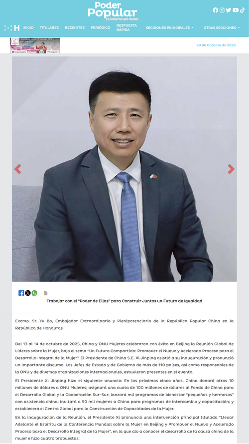 2025年10月29日,驻洪都拉斯大使于波在洪主流媒体《人民权力报》发表题为《携手“她力量”,共筑平等未来》署名文章。系统宣介习近平主席出席本月在北京举办的全球妇女峰会开幕式并发表重要讲话。详细介绍中国妇女事业的发展,指出本次峰会召开不仅是中国对全球妇女事业贡献的新篇章,也是各国携手应对时代挑战、共同推进性别平等的契机。中国愿同洪都拉斯一道,推动全球妇女事业取得新进程,共建人类命运共同体。全文如下: