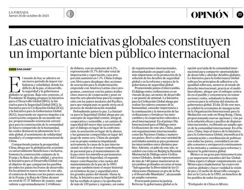 2025年10月30日,驻墨西哥大使陈道江在墨主流媒体《每日报》发表题为《四大全球倡议是重要的国际公共产品》的署名文章,从共享繁荣、共护和平、共促交流、共谋正义四个方面宣介习近平主席提出的四大全球倡议。文章强调,中方期待同墨方一道努力,落实四大全球倡议,让《联合国宪章》承载的和平愿景与发展梦想成为造福人民的现实。全文如下: