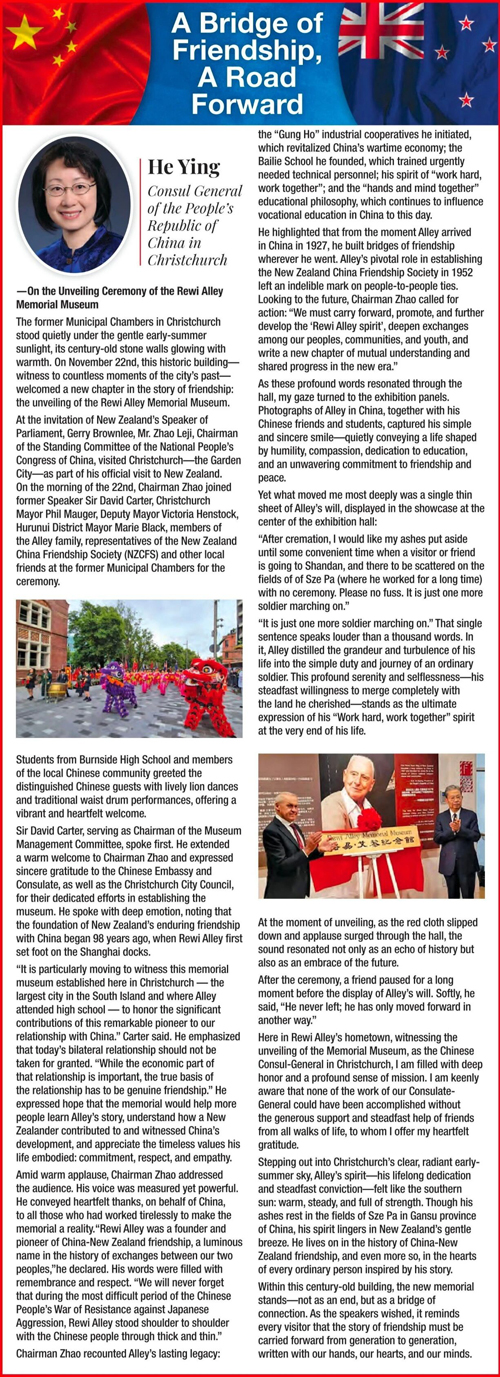 2025年12月4日,新西兰《星报》刊登驻克赖斯特彻奇总领事何颖署名文章《友谊的桥,前进的路》,中文译文如下:
