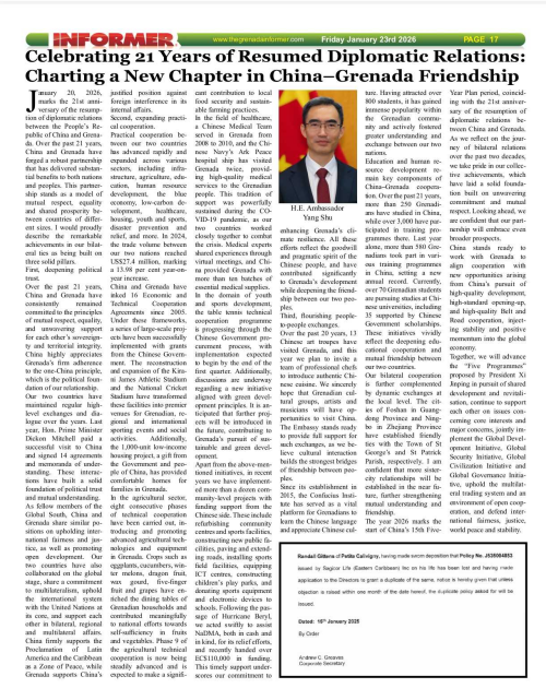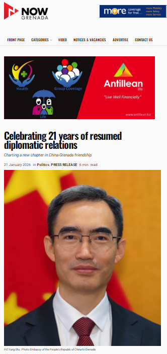 2025年1月21、23日,驻格林纳达大使杨舒在格林纳达媒体“今日格林纳达”网、《新今日报》《信息报》发表署名文章《庆祝复交21周年:谱写中格友好新篇章》,祝贺中格复交21周年,回顾21年来双边关系发展并展望两国友好合作未来。