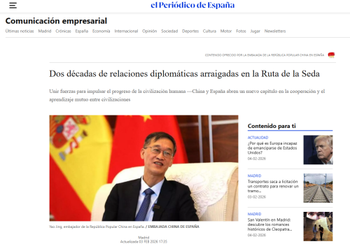 2026年2月3日,驻西班牙大使姚敬在《西班牙报》发表题为《廿载邦谊缘起丝路 携手共促人类文明进步——中国和西班牙文明合作互鉴焕新篇》的署名文章,全文如下:
