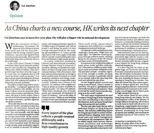 2026年3月23日,外交部驻香港公署特派员崔建春在《南华早报》发表题为《锚定国家航向 共谱香江新篇》的署名文章,从中国发展、中国外交、“一国两制”在港实践三方面宣介全国两会精神,阐释国家高质量发展的宏伟蓝图、彰显担当的外交立场,以及中央支持香港更好融入和服务国家发展大局的战略部署。全文如下: