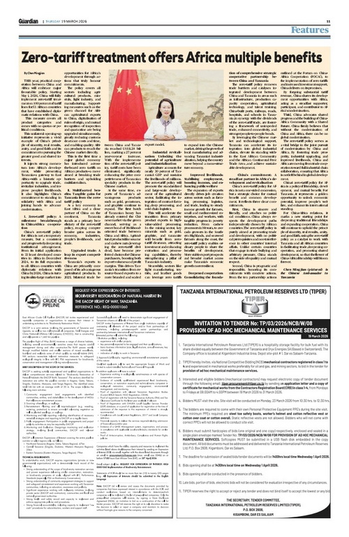 2026年3月19日、3月21日,驻坦桑尼亚大使陈明健在坦桑尼亚主流媒体《卫报》《每日新闻》发表署名文章《中国对非洲零关税:让中国超大市场为坦桑尼亚提供更大的机遇》,宣介中国对非洲零关税及其重大意义,全文如下:
