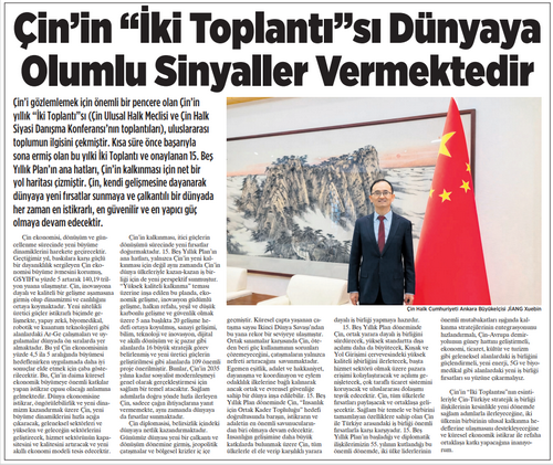 2026年3月20日、21日,驻土耳其大使姜学斌分别在土主流媒体《民族报》、德米罗兰通讯社发表署名文章《中国“两会”向世界传递积极信号》,全文如下: