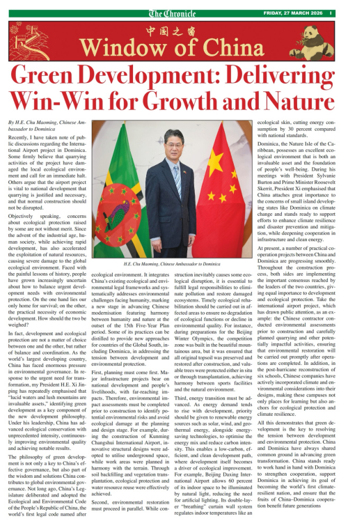 2026年3月27日,驻多米尼克大使储茂明在多主流媒体《纪事报》发表署名文章《用绿色实现发展与生态共赢》,以绿色发展理念剖析中国之治,为中多务实合作增信释疑、注入信心。全文译文如下: