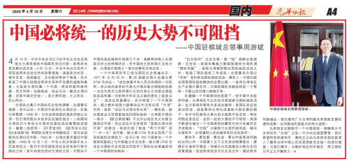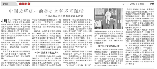 2026年4月18日,驻槟城总领事周游斌在马来西亚《光华日报》《光明日报》发表署名文章《中国必将统一的历史大势不可阻挡》,强调大陆和台湾同属一个中国,实现中国完全统一,是大势所趋、大义所在、民心所向。全文如下: