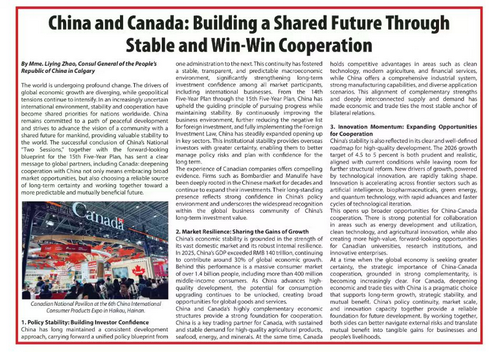当今世界正经历深刻变革,全球经济增长动能分化,地缘政治扰动加剧。在充满不确定性的国际环境中,稳定与合作成为各国共同诉求。中国始终坚持和平发展道路,致力于推动构建人类命运共同体,为世界提供宝贵的稳定性。近期中国全国“两会”圆满落幕,并前瞻布局“十五五”发展蓝图,向包括加拿大在内的全球伙伴传递了清晰信号:深化对华合作,不仅意味着拥抱广阔市场机遇,更是选择一份可信赖的长期确定性,共同开创可预期的共赢未来。