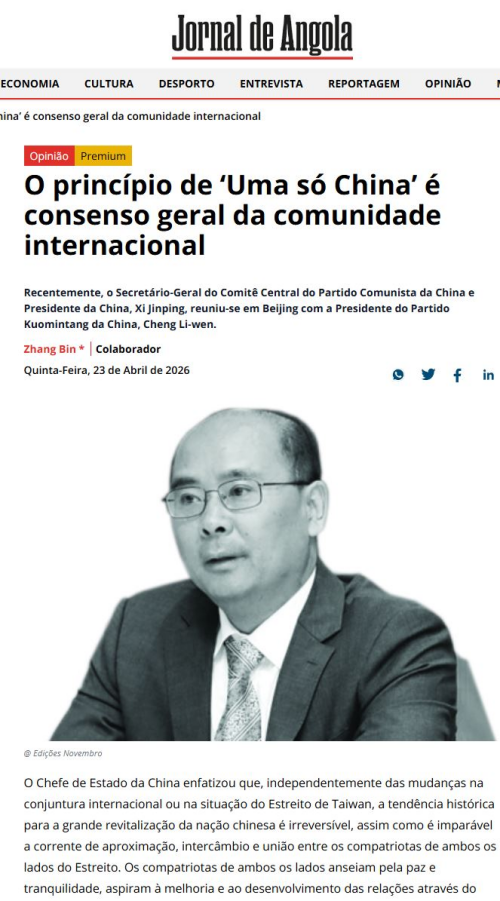 2026年4月23日,驻安哥拉大使张斌在《安哥拉日报》发表署名文章《一个中国原则是国际社会普遍共识》,全文如下: