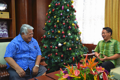 2015年12月21日,驻萨摩亚大使王雪峰拜会萨摩亚总理兼萨摩亚橄榄球联合会主席图伊拉埃帕。
