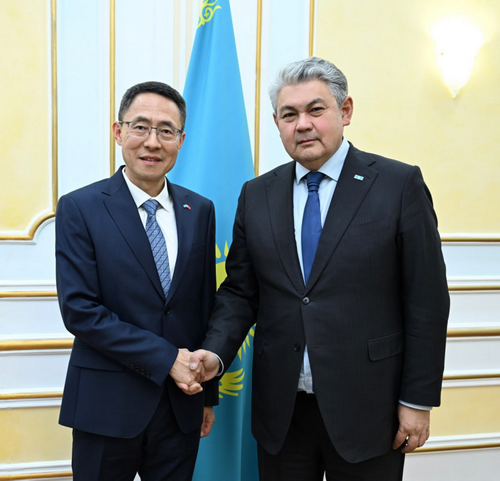 2025年10月1日,驻哈萨克斯坦大使韩春霖拜会哈萨克斯坦外长科舍尔巴耶夫。