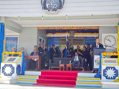 2025年10月16日,驻瑙鲁大使吕进及使馆工作人员应邀出席瑙鲁新一届政府就职仪式,并同阿迪昂总统及新任内阁部长交流互动。