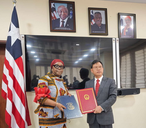 2026年1月9日,驻利比里亚大使尹承武与利外交部长尼安蒂分别代表两国政府于利首都蒙罗维亚签署发展合作协定。利代财长梅尔斯、外交部领导成员等参加签署仪式。