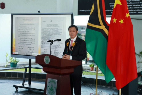 李大使致辞回顾了中瓦建交初心,强调44年来中瓦关系始终走在中国同太平洋岛国关系前列,瓦议会大厦彰显中瓦情谊;中方赞赏瓦方恪守一中原则;愿以“十五五”规划发展成果带动瓦国家建设,与瓦方携手构建更加紧密的新时代中瓦命运共同体。