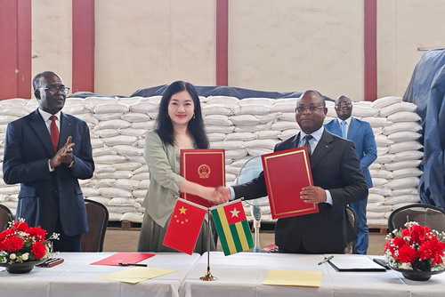 2026年4月2日,中国政府援多哥紧急粮食援助项目举行交接仪式,驻多哥大使王敏与多外交部秘书长萨利福共同签署交接证书,农业部、国家粮食安全署负责人出席。