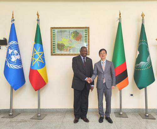 2026年4月24日,驻非盟使团团长蒋烽大使会见赞比亚常驻非盟代表穆昌加大使。
