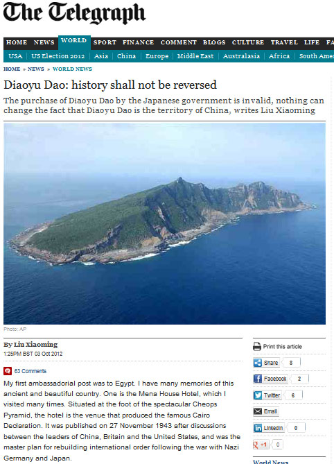 2012年10月3日,英国《每日电讯报》网络版刊登驻英国大使刘晓明题为《历史不容翻案》的署名文章,文章全文如下: