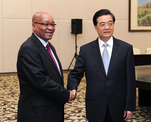 胡锦涛祝贺南非加入金砖国家机制,表示中方愿同南非和其他成员国一道努力,推动金砖国家合作不断取得新成果。祖马表示,感谢中方支持南非成为金砖国家机制成员,南非加入金砖国家机制使非洲在该机制中有了代表性,这不仅对南非有利,而且对非洲大陆有利。