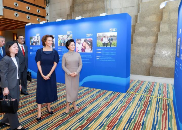 颁奖仪式前,彭丽媛会见阿祖莱,双方就促进全球女童和妇女教育事业发展交换了意见。会见后,彭丽媛和阿祖莱同历年获奖项目代表集体合影,并参观女童和妇女教育奖设立十周年获奖项目图片展。