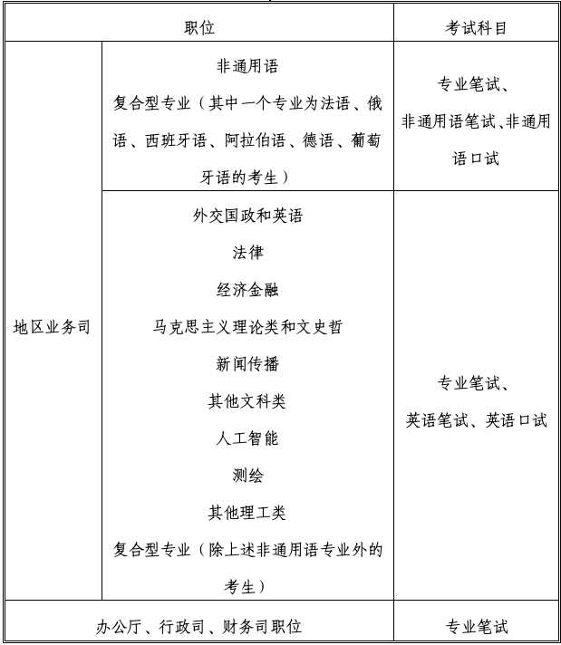 地区业务司岗位专业笔试重点测查考生是否具备从事外交工作的政策水平、综合分析、文字表达能力。外语考试从听、说、读、写、译等方面全面测查考生的外语基础和实际应用能力。办公厅、行政司、财务司专业笔试主要测查与招考职位相关的专业基础和实际应用能力。
