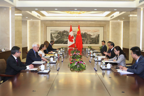 2017年8月9日,外交部长王毅在北京同加拿大外长弗里兰举行第二次中加外长年度会晤。
