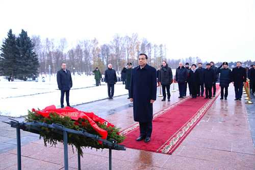 位于圣彼得堡市郊的皮斯卡廖夫公墓,安葬着在世界反法西斯战争中牺牲的近50万烈士和平民。伴随着默哀曲的肃穆旋律,李克强冒着漫天飞雪的严寒天气缓步拾阶而上,向公墓内的祖国母亲纪念碑献花圈。军乐队随即奏响中俄两国国歌,李克强向纪念碑行注目礼,随后在俄高级官员陪同下检阅仪仗队分列式。