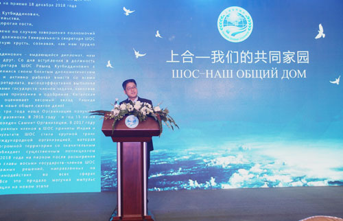 2018年12月18日,外交部副部长乐玉成应邀出席上海合作组织秘书长阿利莫夫离任招待会,并同阿就上合组织发展等问题交换意见。