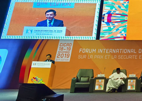 2019年11月18日至19日,外交部非洲司司长戴兵出席在塞内加尔举行的第六届达喀尔非洲和平与安全国际论坛。戴兵在全体会议上发言,介绍中方为促进非洲和平稳定所作努力,表示非洲的和平与安全关乎世界的稳定和发展,非洲国家和国际社会应树立共同、综合、合作、可持续的新安全观,维护非洲国家在非洲和安事务中的主导权,践行多边主义与合作共赢,推动非洲可持续发展,坚持标本兼治,为非洲实现长治久安作出更大贡献。
