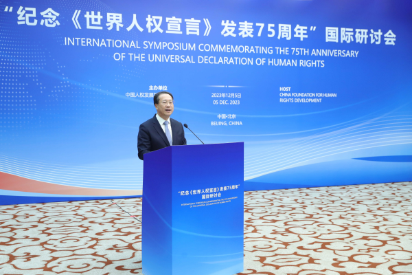 2023年12月5日,外交部副部长马朝旭出席“纪念《世界人权宣言》发表75周年”国际研讨会欢迎招待会并致辞。