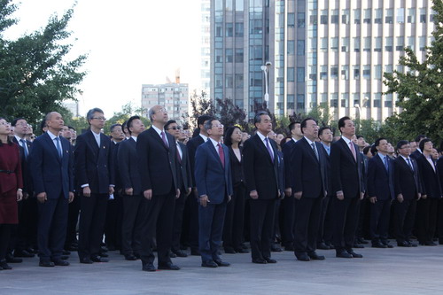2019年10月14日上午,为宣传《中华人民共和国国旗法》、弘扬爱国主义精神,在庆祝中华人民共和国成立70周年的浓厚氛围中,外交部隆重举行升国旗仪式。王毅国务委员兼部长、齐玉书记及全体在京部党委成员、部内部属各单位领导班子成员及干部职工代表共240余人参加。