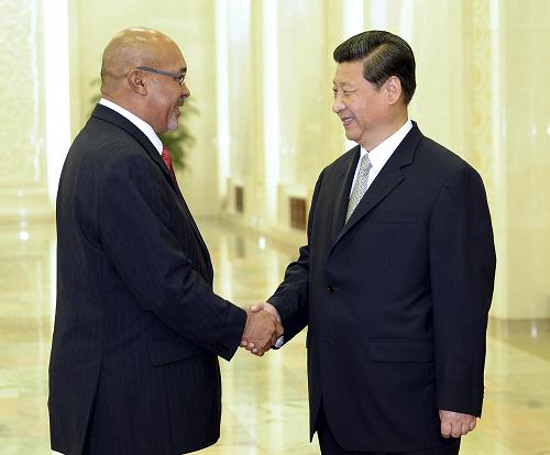 2013年6月26日,国家主席习近平在人民大会堂会见来华出席第二届世界和平论坛的苏里南总统鲍特瑟。