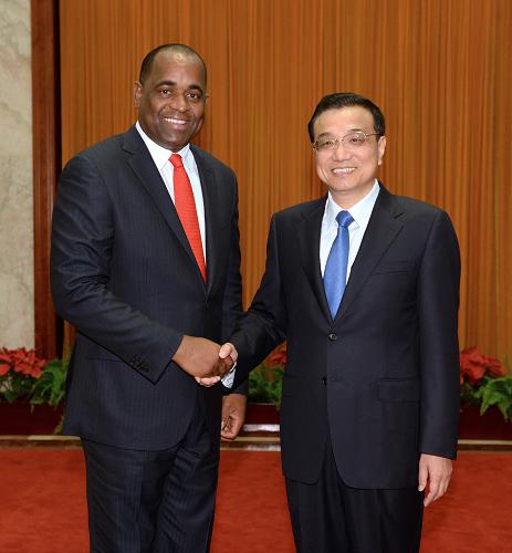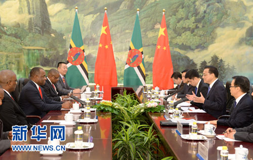 2013年7月17日下午,国务院总理李克强在人民大会堂会见来华出席生态文明贵阳国际论坛2013年年会的多米尼克总理斯凯里特。