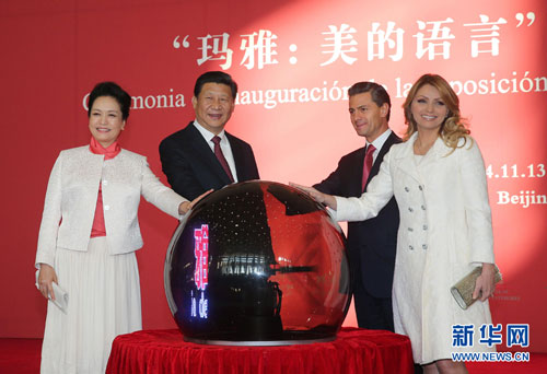 2014年11月13日,国家主席习近平同墨西哥总统培尼亚共同出席在国家博物馆举行的“玛雅:美的语言”文化展开幕式。