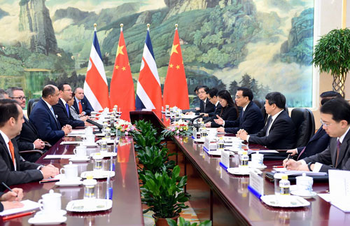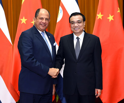 2015年1月8日下午,国务院总理李克强在人民大会堂会见来华访问并出席中拉论坛首届部长级会议的哥斯达黎加总统索利斯。