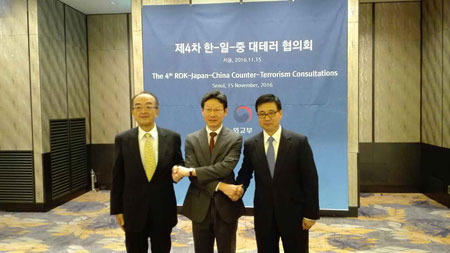 2016年11月15日,外交部涉外安全事务司司长刘光源同韩国外交部国际安全事务大使申孟浩、日本外务省反恐和有组织犯罪政策担当大使隈丸优次在首尔共同主持中韩日第四次反恐磋商。三方重点就国际地区反恐形势、各自反恐形势和中韩日反恐合作等交换了意见。