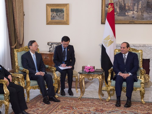 当地时间2019年1月16日,习近平主席特别代表、中共中央政治局委员、中央外事工作委员会办公室主任杨洁篪在开罗会见埃及总统塞西。