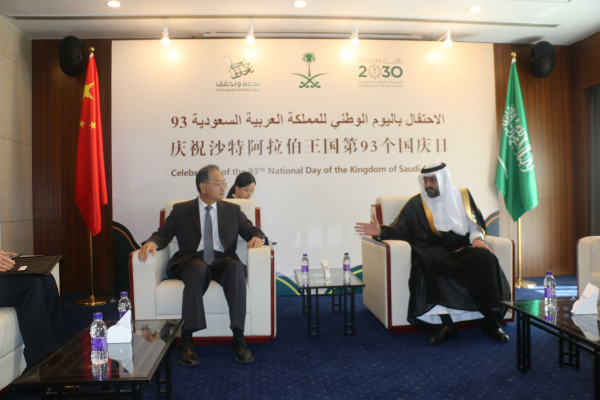 2023年9月20日,外交部副部长邓励出席沙特驻华使馆举行的沙特国庆招待会。正在访华的沙特工业和矿产资源大臣胡莱夫等沙方高官、多国驻华使节和各界友好人士参加。