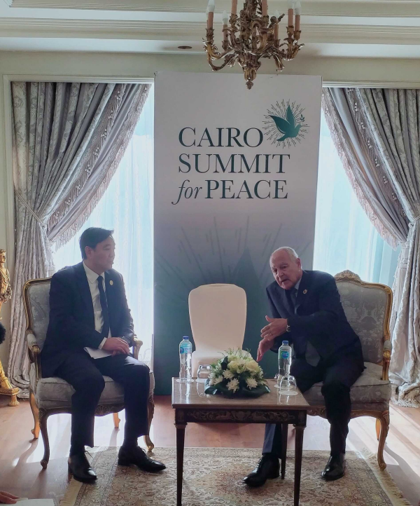 2023年10月21日,中国政府中东问题特使翟隽在出席巴勒斯坦问题开罗和平峰会期间会见阿拉伯联盟秘书长盖特,就当前巴以局势交换意见。