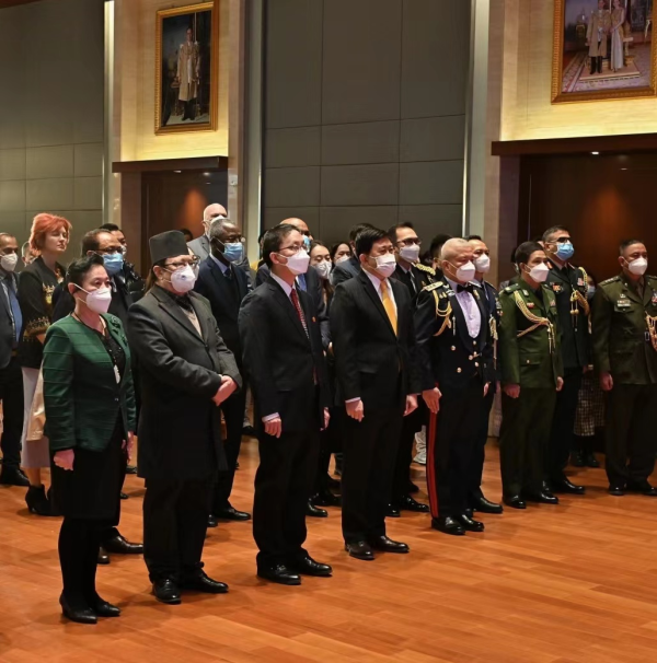 2022年12月12日,外交部亚洲司司长刘劲松应邀出席泰国国庆招待会,向泰国驻华大使阿塔育致贺,并进行了亲切友好的寒暄。