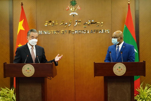 当地时间2022年1月8日,国务委员兼外长王毅在马累同马尔代夫外长沙希德共同会见记者。