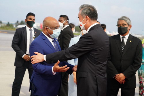 当地时间2022年1月8日,国务委员兼外长王毅在马累同马尔代夫外长沙希德举行会谈。