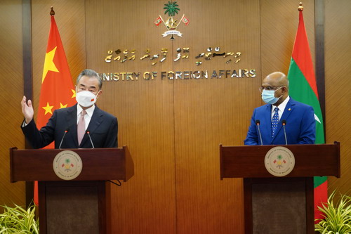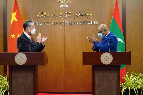 王毅表示,中国一贯主张,国家不分大小强弱一律平等。无论是在应对印度洋大海啸,还是抗击新冠肺炎疫情期间,我们都同马尔代夫人民站在一起,守望相助,共克时艰。中方始终支持马方维护国家主权和领土完整,支持马方走符合本国国情的发展道路,支持马方奉行独立自主的外交政策。经过50年共同努力,中马关系已经成为国家之间友好交往、互利共赢的典范。
