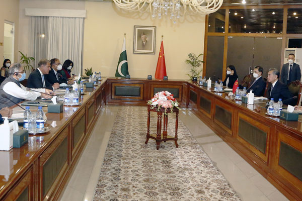当地时间2022年3月21日,国务委员兼外长王毅在伊斯兰堡同巴基斯坦外长库雷希举行会谈。
