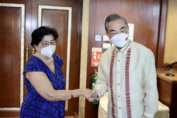 当地时间2022年7月6日,国务委员兼外长王毅在马尼拉会见菲律宾国家安全顾问卡洛斯女士。