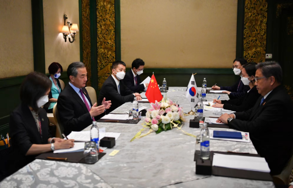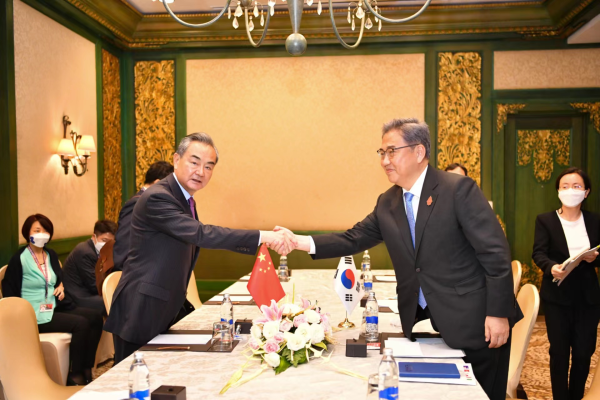 当地时间2022年7月7日,国务委员兼外长王毅在巴厘岛出席二十国集团外长会期间会见韩国外长朴振。