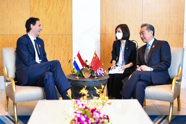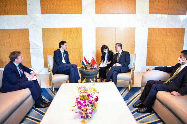 当地时间2022年7月8日,国务委员兼外长王毅在巴厘岛出席二十国集团外长会期间会见荷兰副首相兼外交大臣胡克斯特拉。