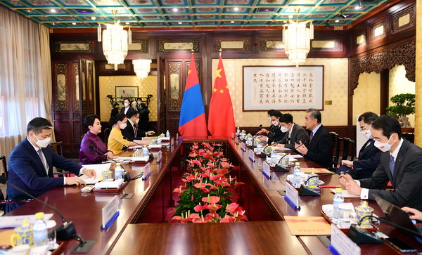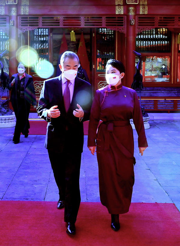 2022年2月5日,国务委员兼外长王毅在钓鱼台国宾馆会见陪同奥云额尔登总理来华出席北京冬奥会开幕式的蒙古国外长巴特策策格。