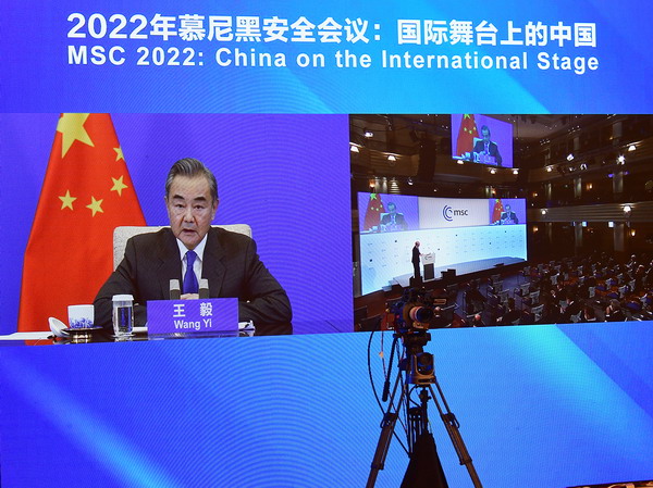 2022年2月19日晚,国务委员兼外长王毅在北京应邀以视频方式出席第58届慕尼黑安全会议中国专场并发表主旨讲话。
