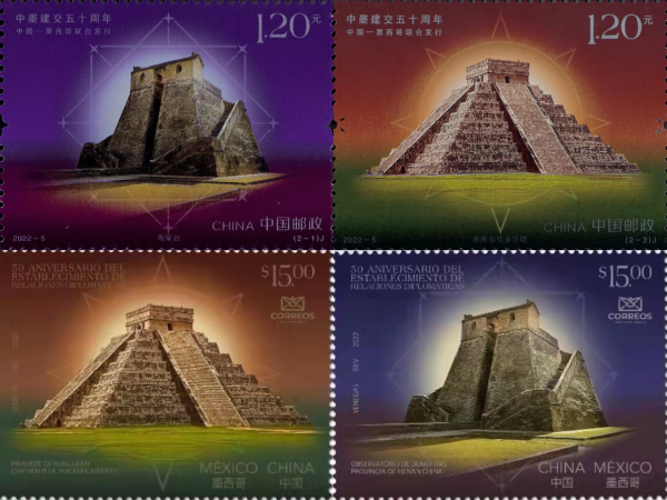招待会现场还举行了《中墨建交五十周年》纪念邮票揭幕仪式。该套纪念邮票由中墨邮政部门于2月14日联合发行,邮票图案分别为河南登封观星台和库库尔坎金字塔,中华文明与玛雅文明于方寸间交相辉映。