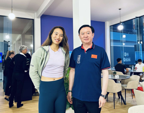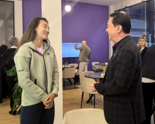 2024年11月2日,驻沙特大使常华看望慰问正在利雅得参加WTA(女子网球协会)2024年终总决赛的中国著名女子网球运动员郑钦文。