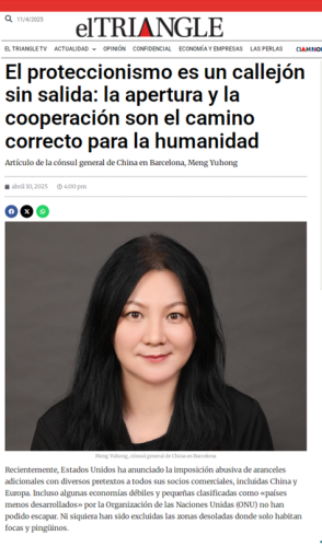 2025年4月10日,驻巴塞罗那总领事孟宇宏在西班牙《三角报》发表署名文章《保护主义没有出路,开放合作才是人间正道》,全文如下: